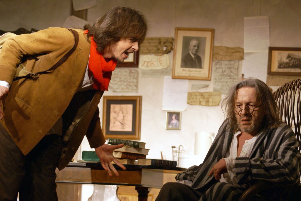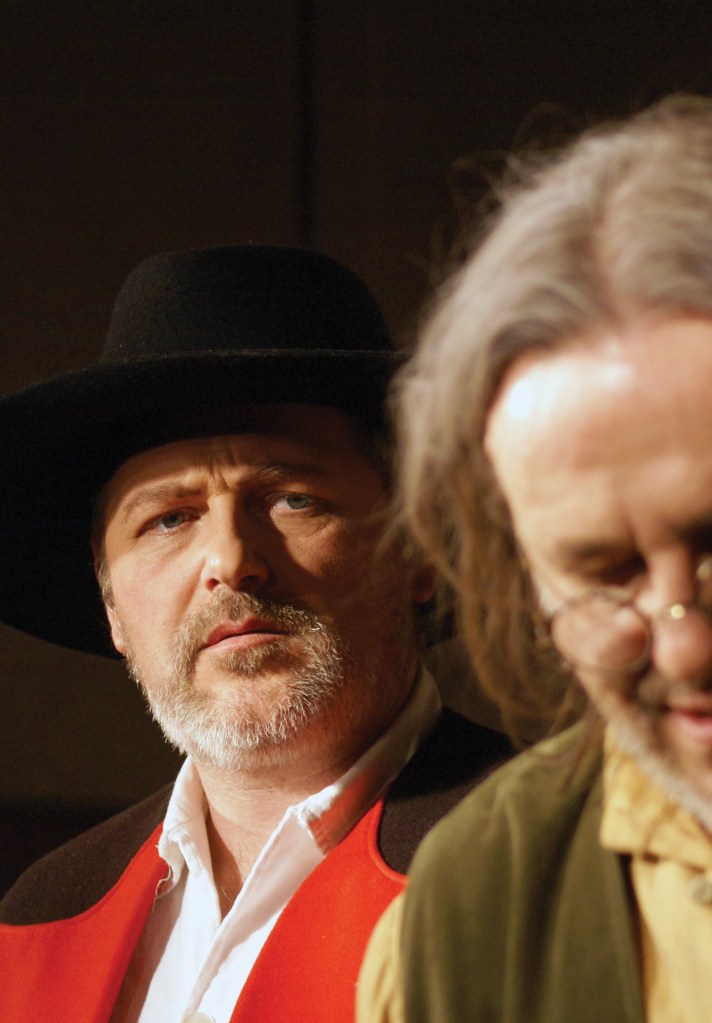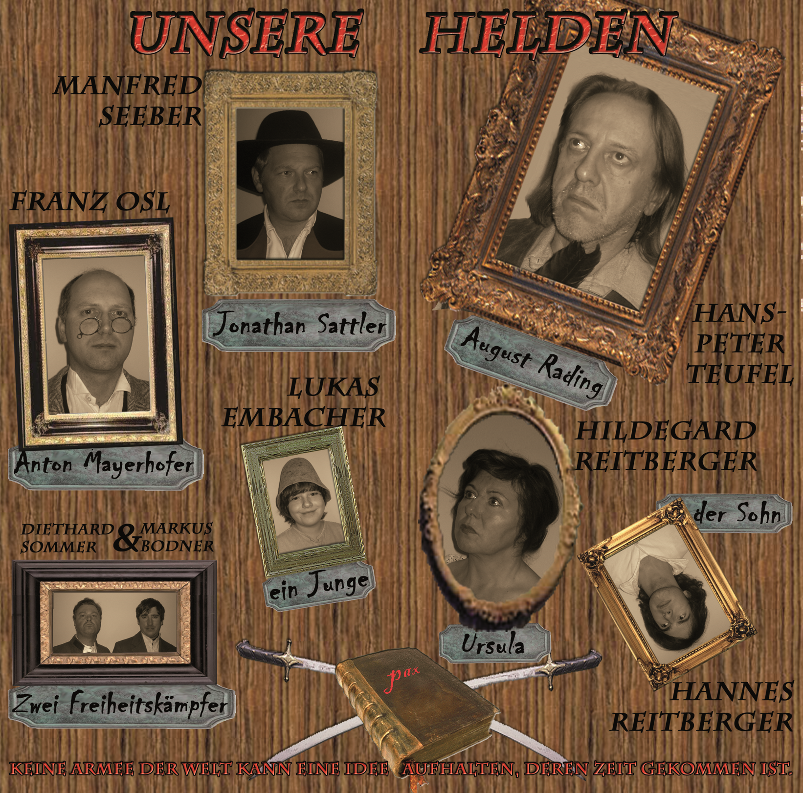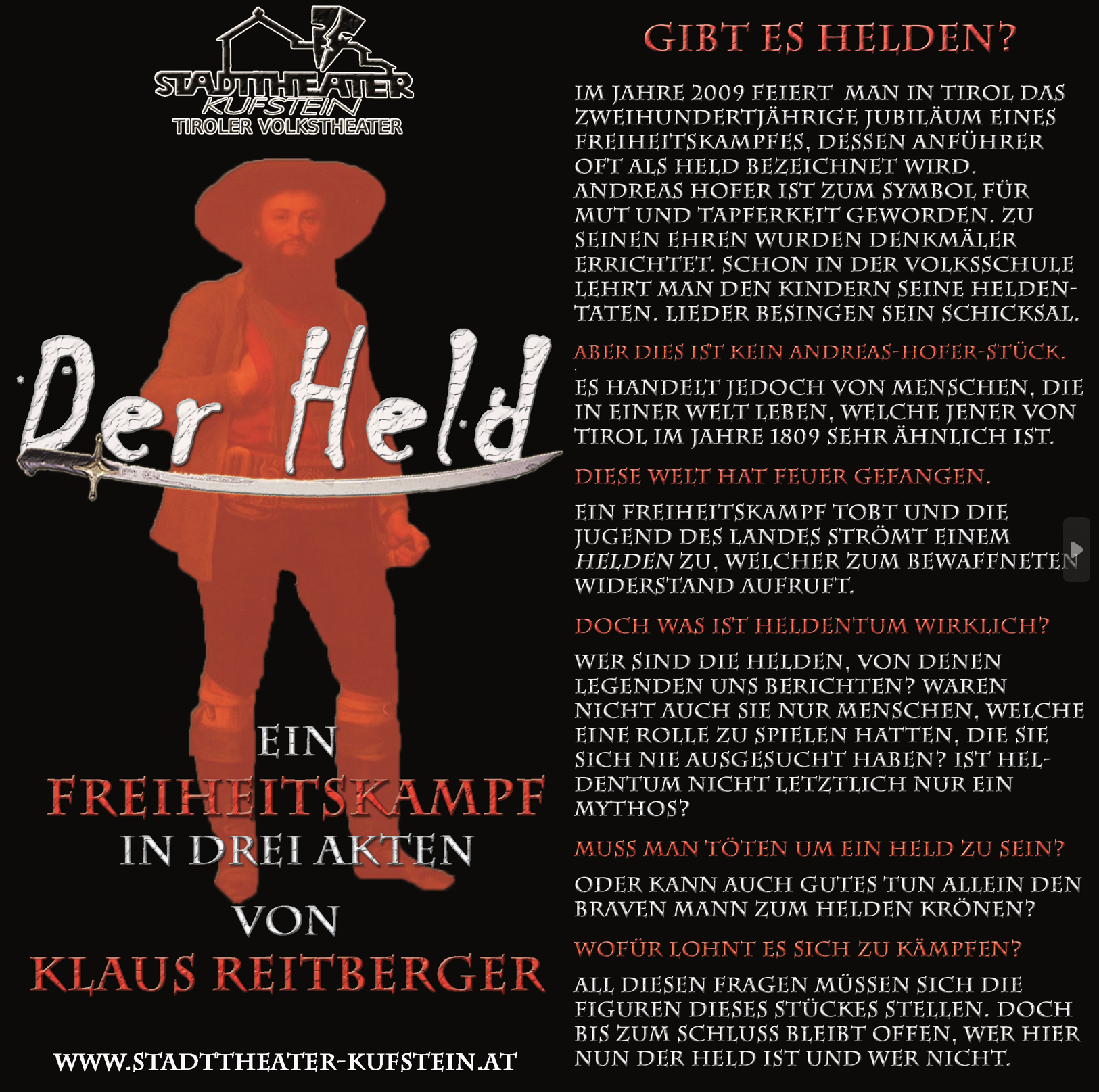 Im Februar 2009 inszenierte ich zum ersten Mal ein Stück aus eigener Feder. Anlass dazu war das 200-jährige Jubiläum des Tiroler Freiheitskampfes von 1809. Hier wollte ich der gemeinhin viel zu unkritischen Rezeption der Andreas Hofer Figur eine beißend scharfe Auseinandersetzung mit dem Helden-Begriff gegenüberstellen. Der gesellschaftlich akzeptierte Held wird zum Antihelden. Als starkes gegenüber tritt die Figur der pazifistischen Schriftstellers August Rading in den Vordergrund. „Der Held“ war auch das erste Stück, bei welchem ich mit Schauspieler Hanspeter Teufel zusammenarbeiten durfte. Am 20. Februar feierten wir eine fulminante Uraufführung, zu der auch ein wunderbares Publikum seinen Beitrag leistete. Aufgrund der großen Nachfrage gab es zwei Zusatzaufführungen.