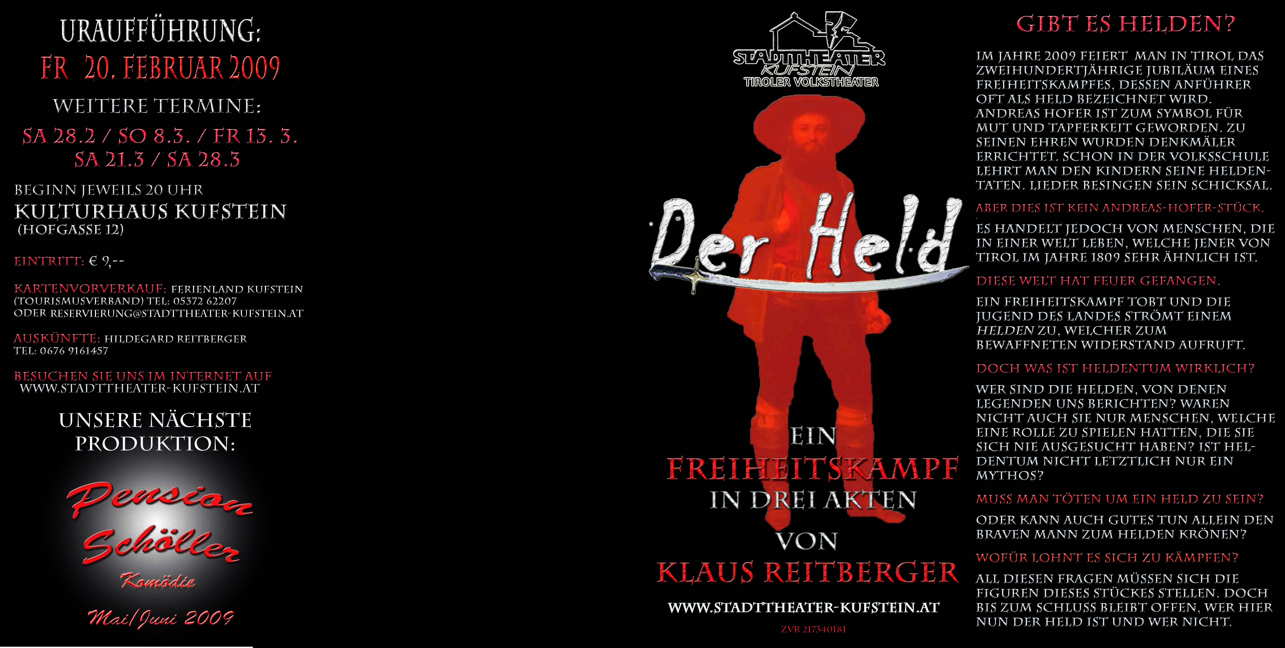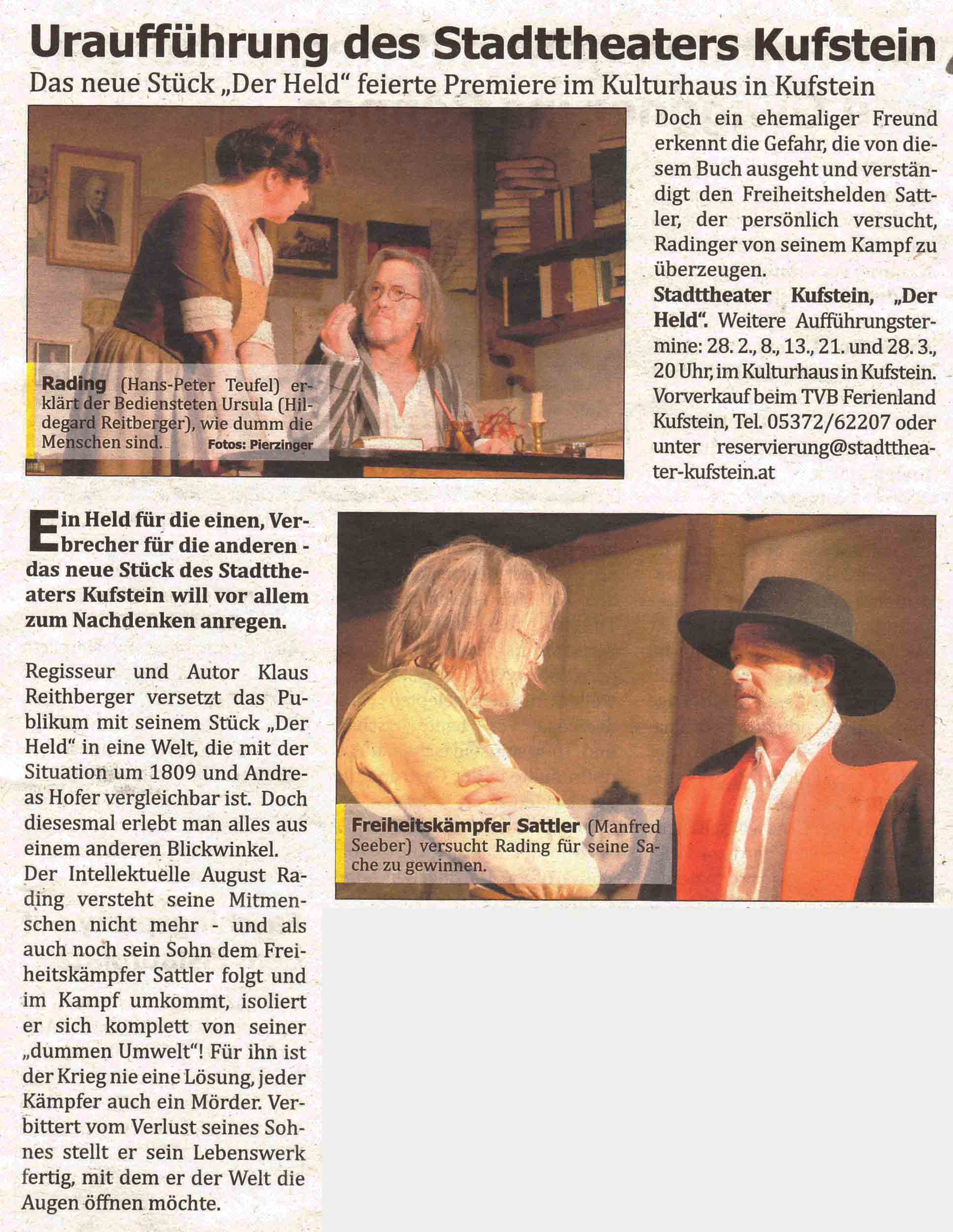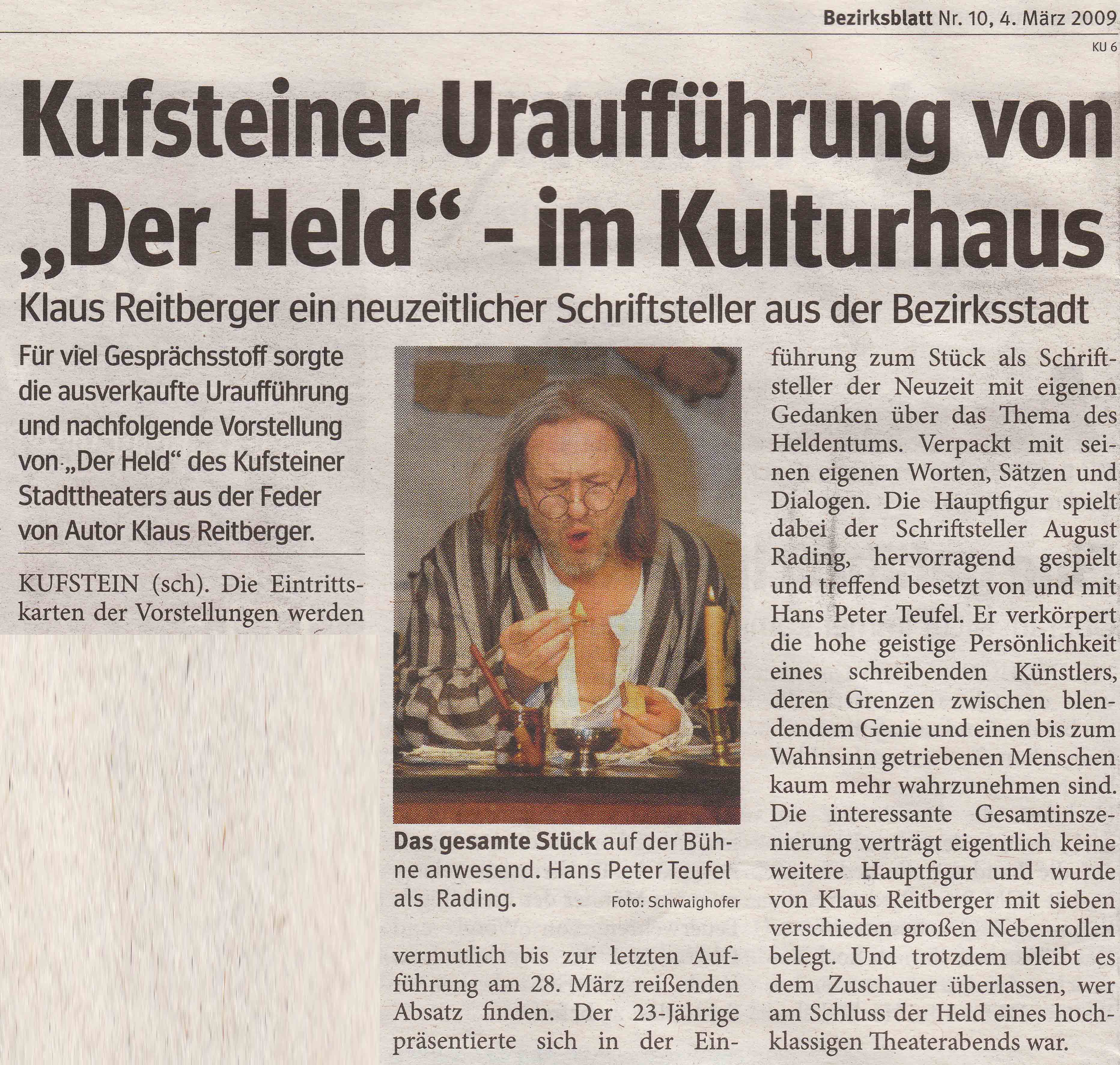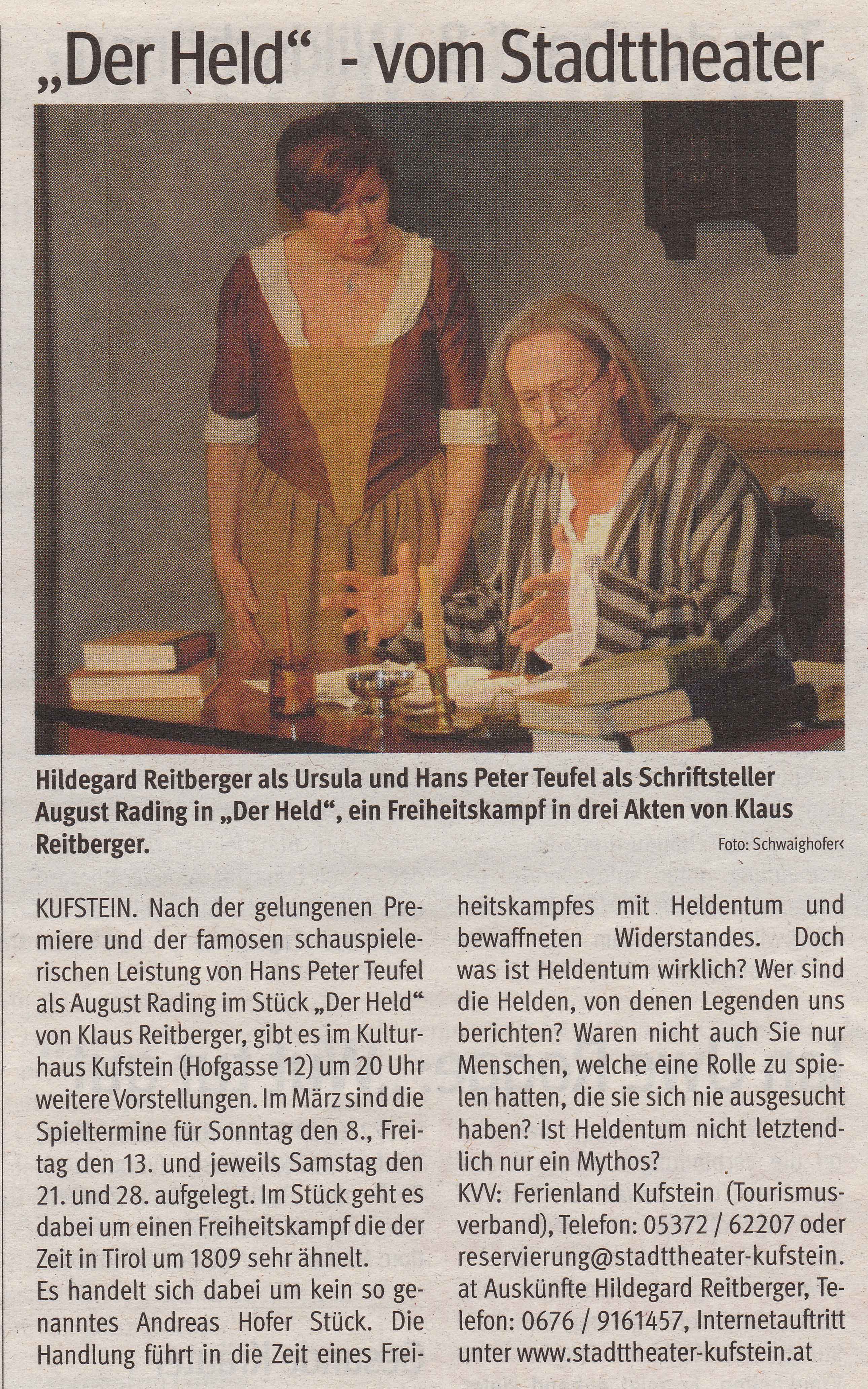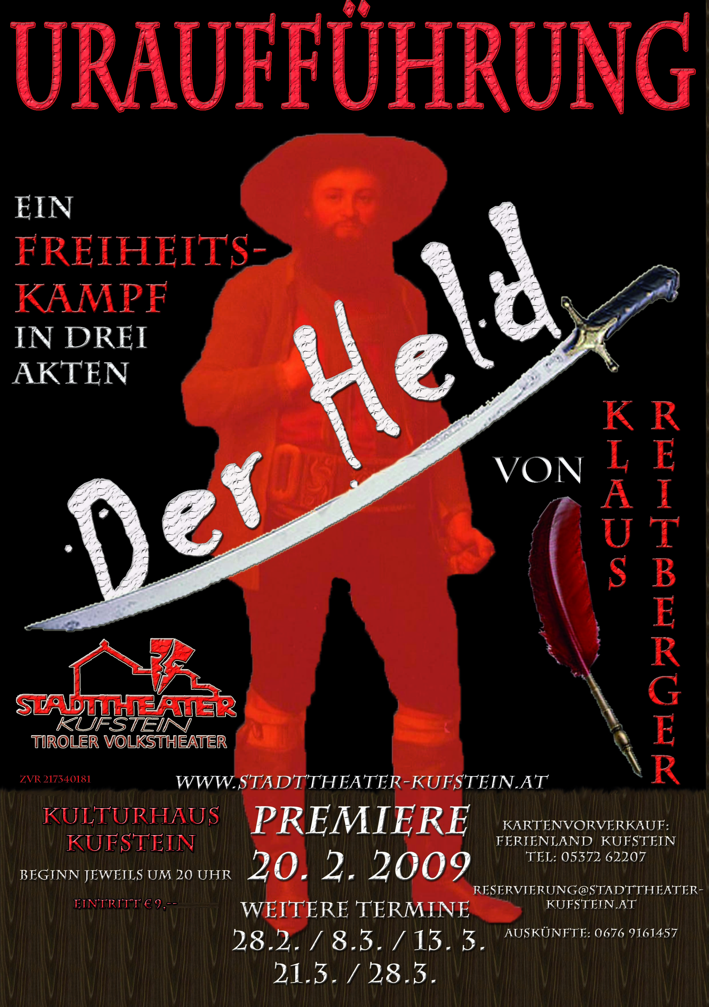 Nach fast zwei Monaten aktiver Spielzeit, nach acht erfolgreichen Aufführungen vor vollen Publikumsrängen, nach vielen tollen Zeitungsberichten und Fernsehbeiträgen, nach langem Applaus und vielen wunderbaren Momenten voll tiefer Emotionen ging am 19. April die letzte Vorstellung meines Stückes „Der Held“ über die Bühne. Es war eine schöne Zeit. Wir haben mehr erreicht, als wir uns erhofft hatten: mehr Publikum, mehr Rührung, mehr positive Resonanz. Ich möchte allen danken, die dieses von Anfang bis Ende glänzend verlaufende Projekt mitgestaltet und möglich gemacht haben, den Schauspielern, den Bühenbildnern, den Masken-Damen und vielen anderen. Danke auch den eifrigen Zeitungsmenschen für ihre üppige Berichterstattung, danke den Tirol-TV Leuten und den Schreibern des Darstellenden Spiels. Danke auch jenen in den Rängen des Publikums, die mir im Nachhinein ihre Gedanken über dieses Stück mitgeteilt haben. Ich habe viele emails und Briefe erhalten, in denen mir bekannte und unbekannte Menschen sagten, wie nahe ihnen dieses Stück gegangen ist und wie sehr es sie zum Denken angeregt hat. Dass wir viel Publikum hatten ist eine Sache, aber erst durch eure Worte weiß ich, dass ich mein Ziel – nämlich Tränen zu rühren und Gedanken zu zünden – in hohem Maße erreicht habe. Danke!