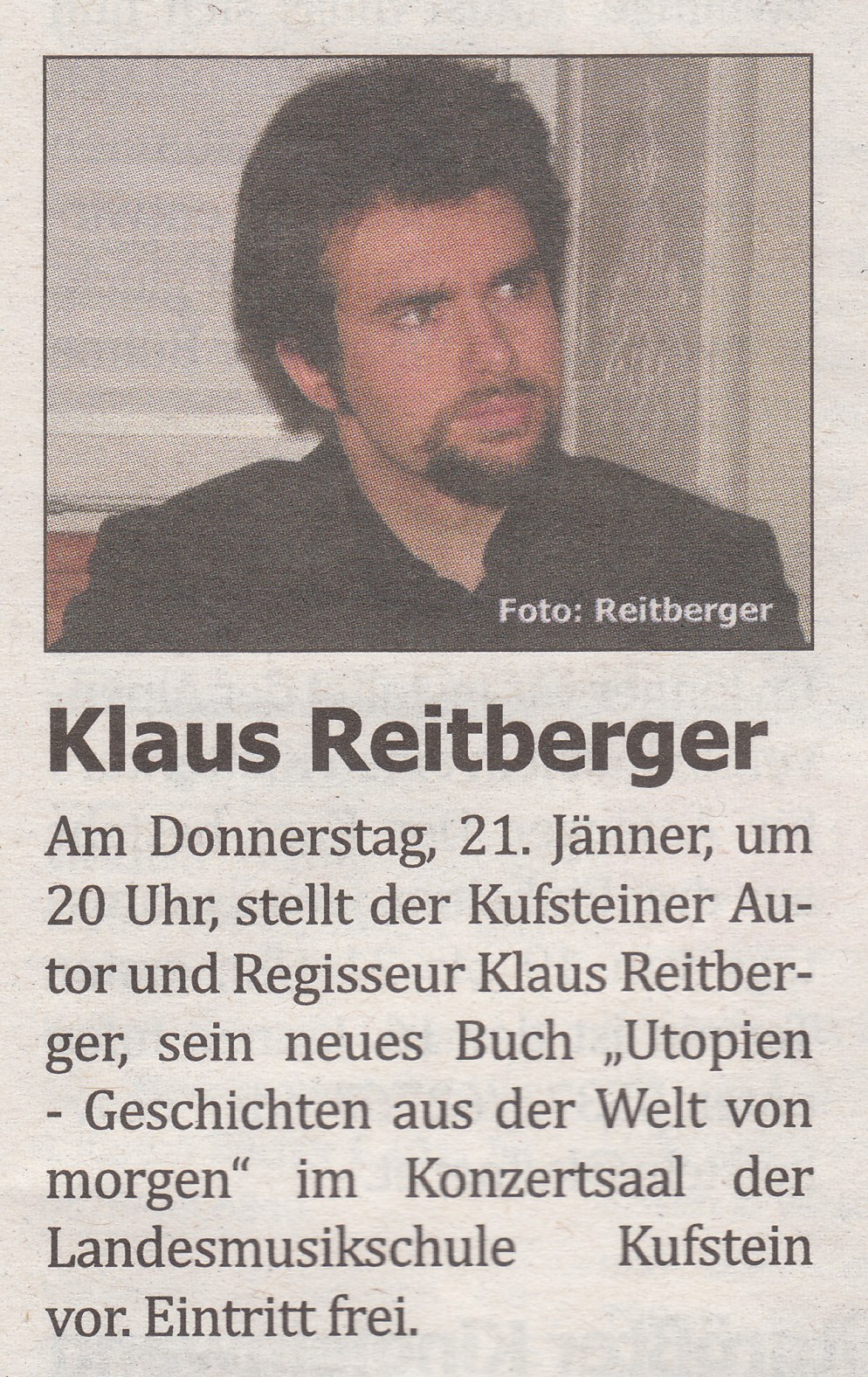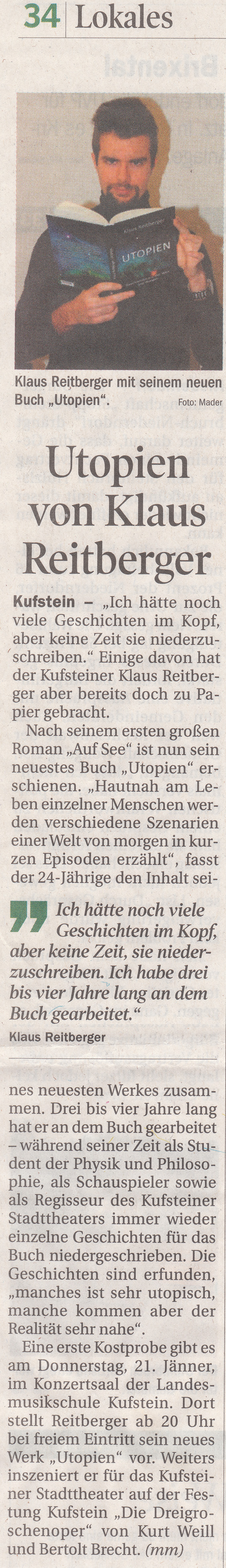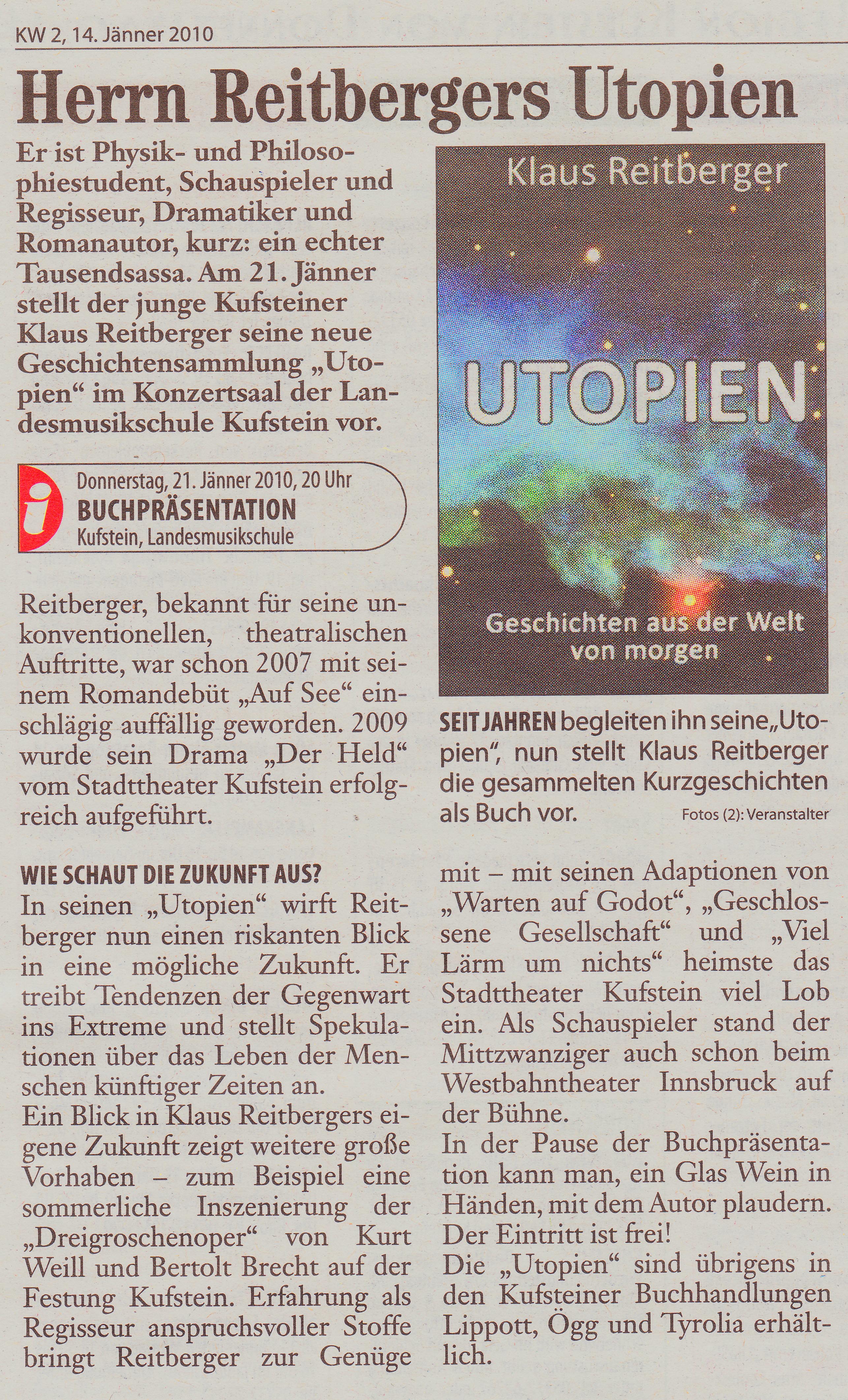 Das Buch „Utopien“ erscheint im Januar 2010 im Eigenverlag und wird im Laufe des Frühjahrs bei mehreren Lesungen (siehe Termine) präsentiert werden. Erhältlich bei den Kufsteiner Buchhandlungen Tyrolia, Ögg und Lippott, sowie auch bequem und einfach über diese Homepage.