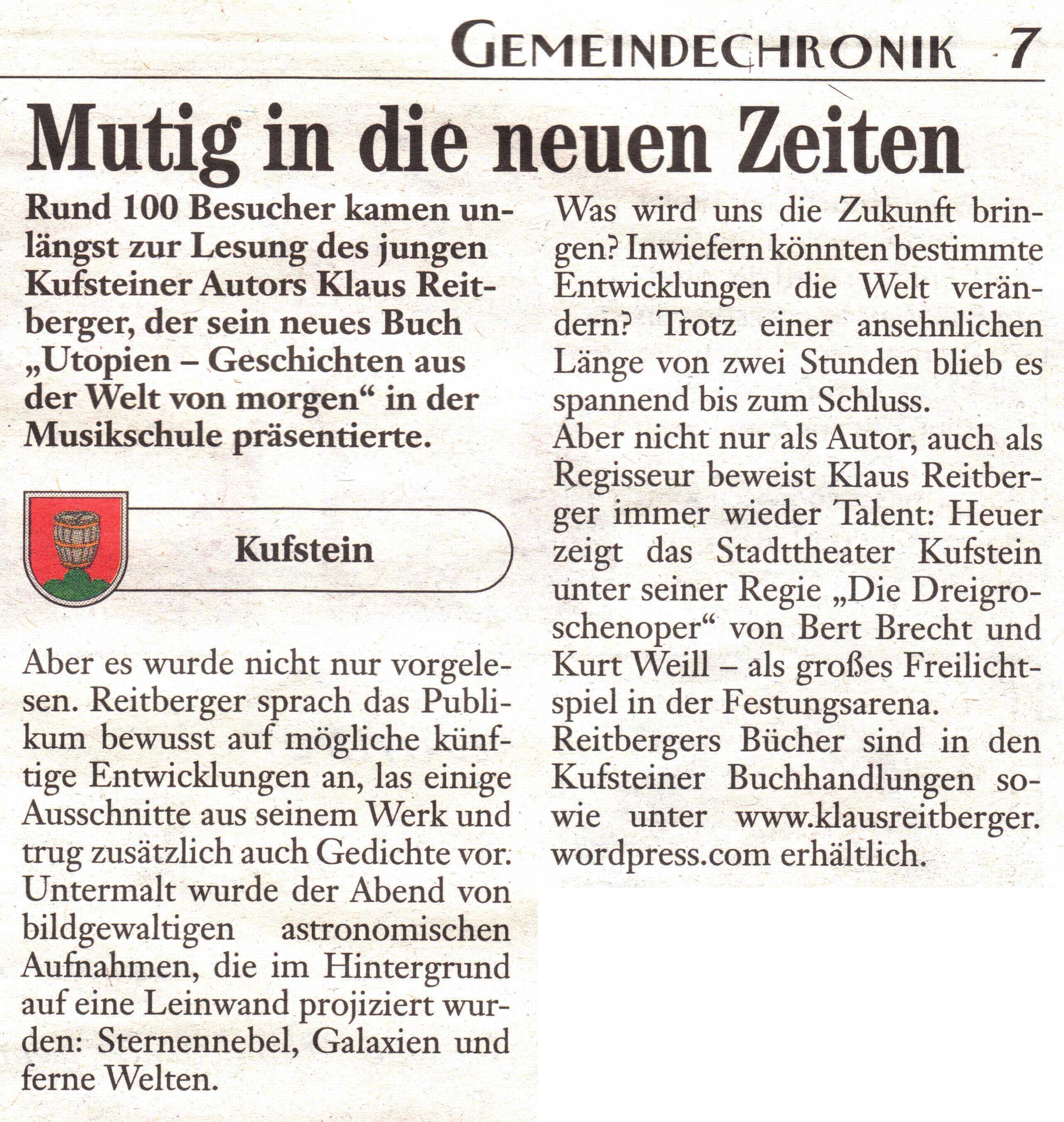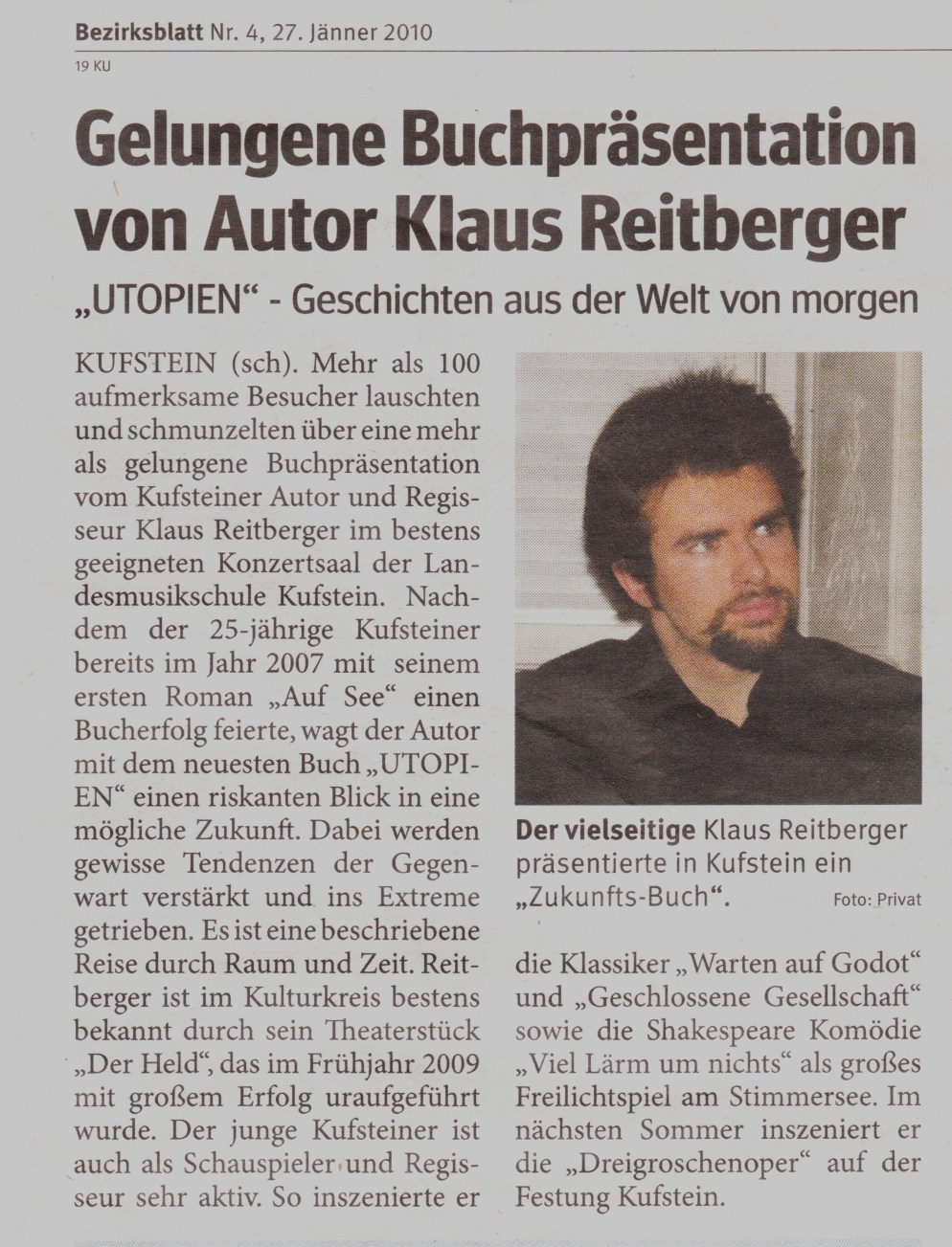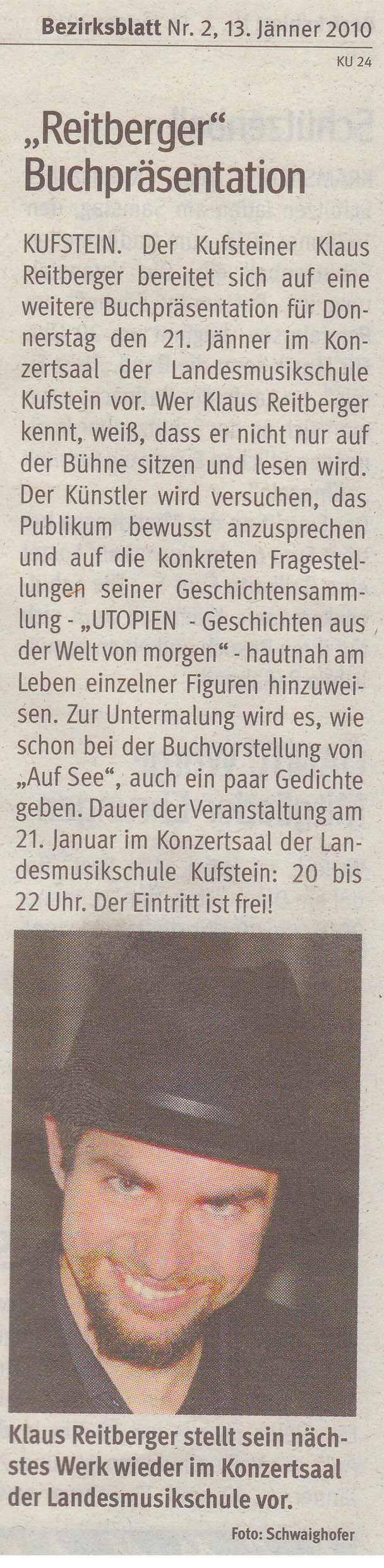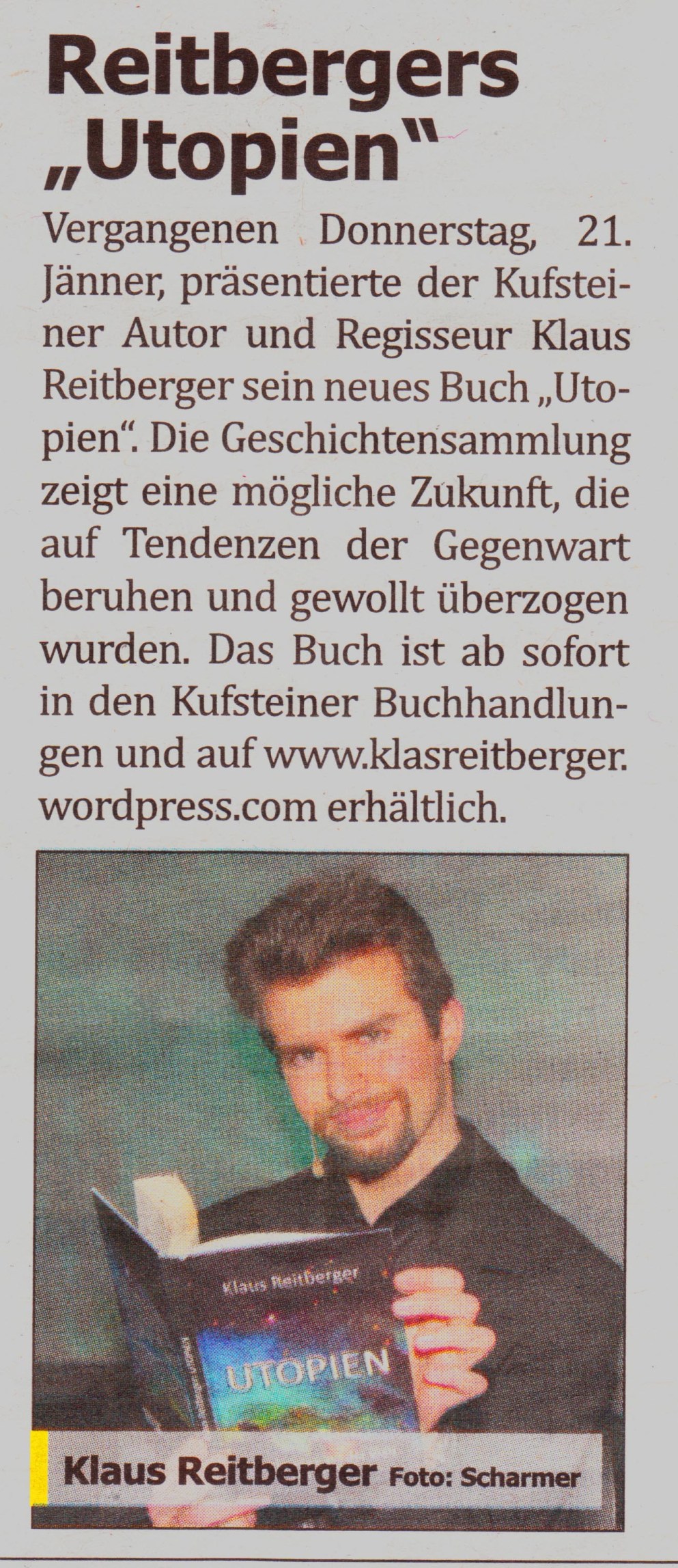 Das Buch „Utopien“ erscheint im Januar 2010 im Eigenverlag und wird im Laufe des Frühjahrs bei mehreren Lesungen (siehe Termine) präsentiert werden. Erhältlich bei den Kufsteiner Buchhandlungen Tyrolia, Ögg und Lippott, sowie auch bequem und einfach über diese Homepage.