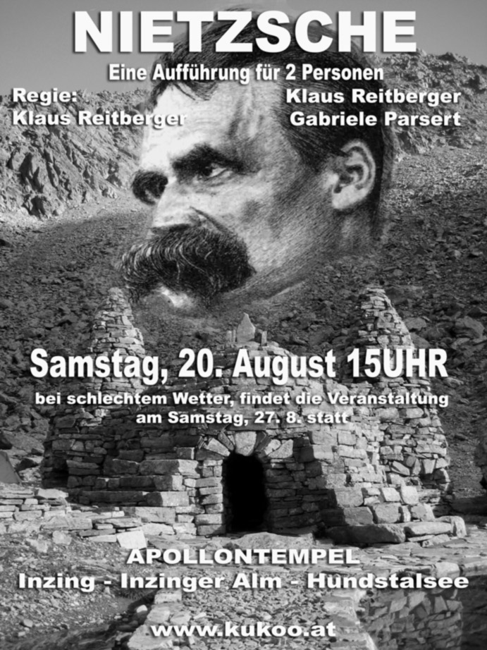 Kein Philosoph vermochte seine Gedanken in so wortgewaltigen Bildern und atemberaubend schönen Metaphern auszudrücken wie Friedrich Nietzsche. In Gedenken an den Philosophen – 111 Jahre nach seinem Tod – hat der Kufsteiner Regisseur Klaus Reitberger die literarisch opulentesten Textpassagen und schönsten Gedichte Nietzsches zu einer einstündigen Inszenierung für zwei Darsteller verarbeitet. Diese wird am Samstag, dem 20. August 2011 vor der wunderschönen Kulisse des Apollon Tempels am Hundstalsee bei Inzing auf 2300 Meter Höhe aufgeführt werden. Beginn: 15.00 Uhr. Es spielen: Klaus Reitberger und Gabriele Parsert. Der Eintritt ist frei. Ersatztermin bei Schlechtwetter: 27. August.