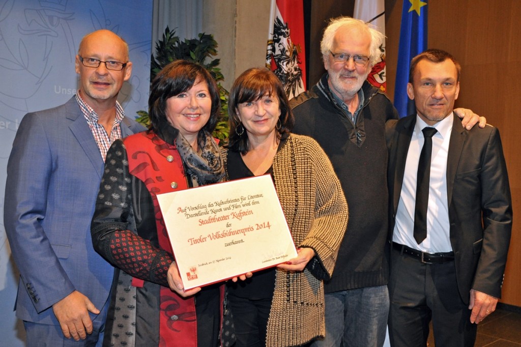 Die Übergabe des Tiroler Volksbühnenpreises am 17.11. 2014. Im Bild von links nach rechts: Johannes Reitmeier (Intendant des Tiroler Landestheaters, Hildegard Reitberger (Obfrau des Stadttheaters Kufstein), Beate Palfrader (Kulturlandesrätin von Tirol), Ekkehard Schönwiese (Dramaturg des Theaterverbandes Tirol) und Helmut Häusler (Schauspieler am Tiroler Landestheater)
