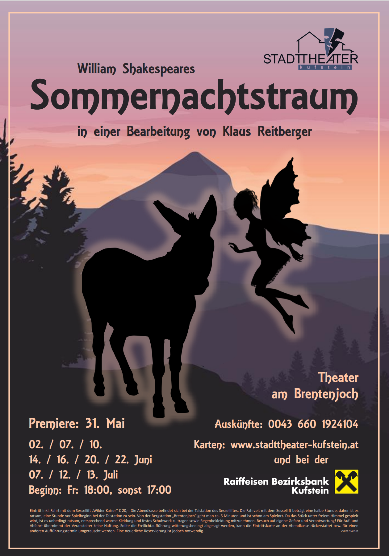 Auf über 1200 Metern Seehöhe wird die wohl bekannteste und erfolgreichste Komödie des Jahrtausendpoeten William Shakespeare gespielt. Nach geruhsamer Fahrt im Sessellift kann sich das Publikum auf Natur- und Kulturgenuss im Naturschutzgebiet Wilder Kaiser freuen. In unmittelbarer Nähe des Weinbergerhauses mit wunderbarer Sicht auf den schroffen Felsengipfel des Scheffauers zeigt ein dreizehnköpfiges Ensemble rund um Regisseur Klaus Reitberger eine teils klassische, teils mit Lokalkolorit angehauchte Interpretation des Sommernachtstraums.