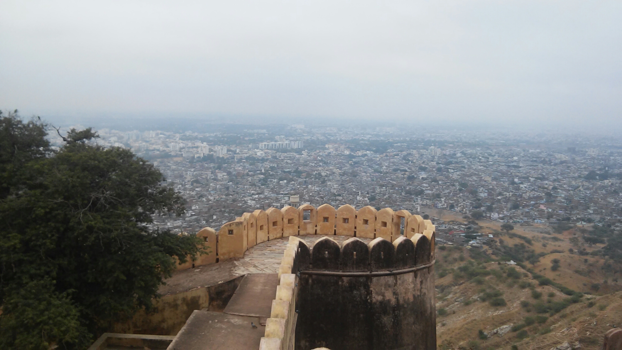 Nach einem guten Thali, nahm ich ein Fahrradriksha nach Norden zum Fuß der Felswand, auf welcher die Burg von Nahargarh thront. Auch von hier aus hatten die Maharajas über Jaipur geherrscht. Ich stieg die vielen Serpentinen zum Verteidigungswall empor. In der Burg selbst gibt es einen kleinen Palast zu sehen, welcher schöne Torbögen und Wandmalereien aufweist. Von überall auf den Mauern hat man fantastische Aussicht auf das riesige Jaipur, das sich unter einem unheilvollen wolkenverhangenen Himmel bis zum Horizont erstreckte.