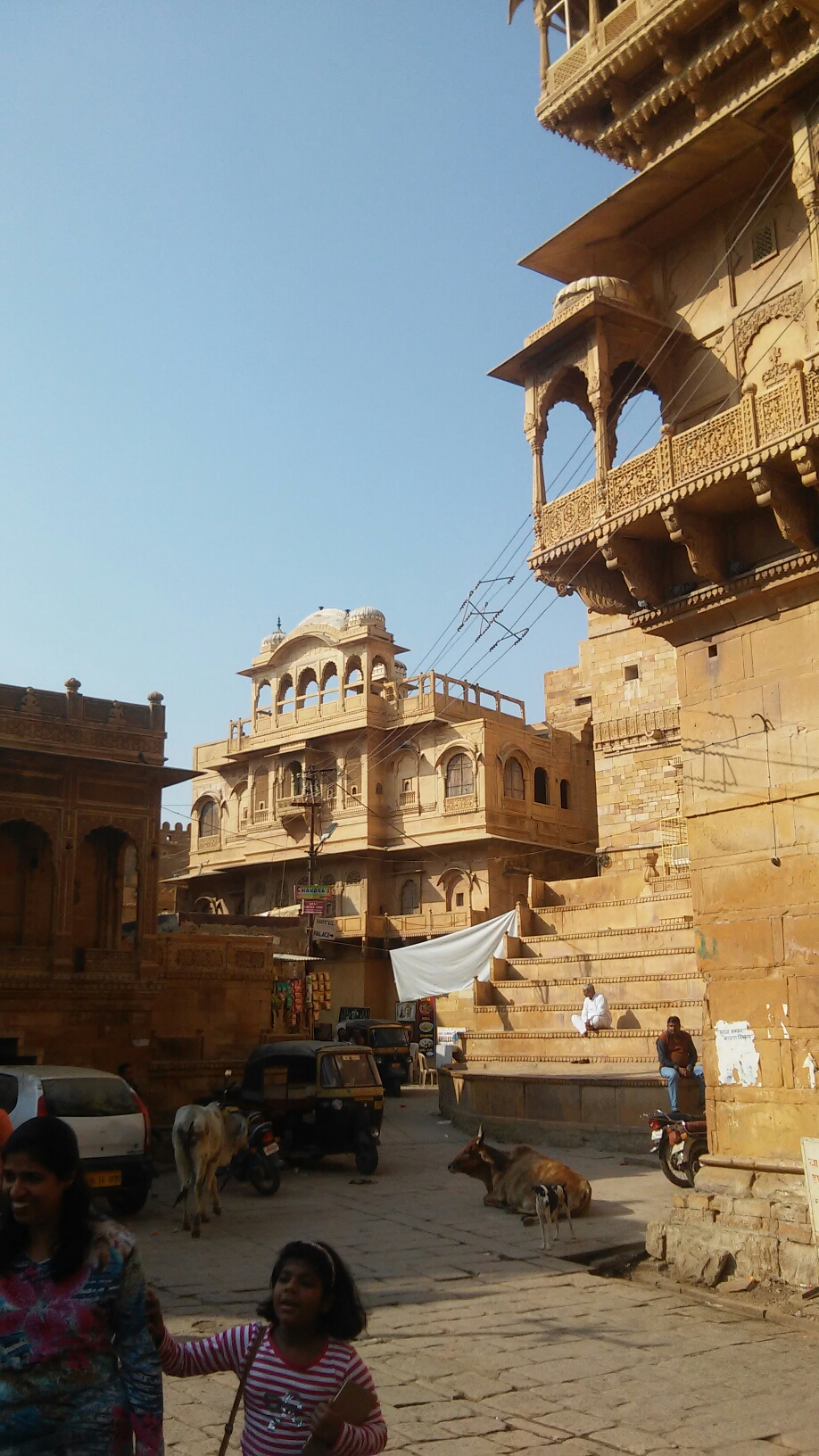 Nachdem ich meine Kamelsafari für den folgenden Tag (und die Nacht) organisiert hatte, erkundete ich das Burgschloss, von wo einst die Maharawals von Jaisalmer geherrscht hatten. Wie verwirrend und interessant es doch ist, dass die Herrscher der einzelnen Rajput-Klans unterschiedliche Titel tragen: Maharana in Udaipur, Maharawal in Jaisalmer und Maharaja in Jaipur. Jodhpur hat auch einen Maharaja. Von Bikaner weiß ich es nicht.