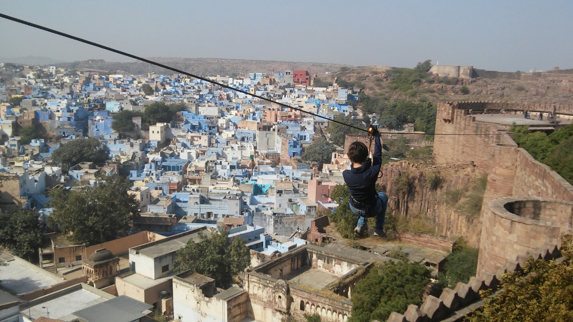 Ich teilte die Tour mit einer Schulklasse aus San Francisco, die mit ihrem Religionslehrer auf einer einmonatigen Indienexkursion war. Der symphatische Lehrer (trotz Übergewicht besonders geschickt auf der Zip-line) fokussierte seinen Unterricht auf Jainismus und Hinduismus. Daher das Ziel der Schulreise. Zwischen den einzelnen Flügen unterhielten wir uns über Taoismus und Weltpolitik. Zum dritten Mal auf dieser Reise bekam ich die Anregung, Howard Zinn auf meine Leseliste zu setzen. Jedenfalls ist der Flying Fox von Mehrangarh sehr zu empfehlen. Spannend und hoch. Schön und weit.