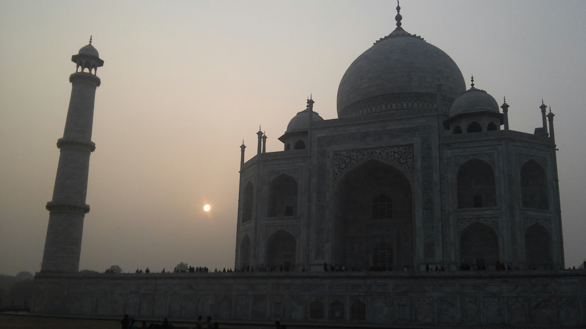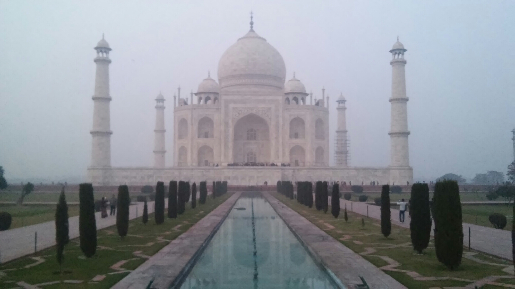 Die nächste Station war die grüne Parkanlage Mehtab Bagh mit ihren Moscheeruinen. Der Ort wäre an sich nichts Besonderes, läge er nicht genau auf einer Linie mit Agras Hauptattraktion am anderen Flussufer. Obwohl ich schon den ganzen Tag in Agra war, hatte der Nebel das Taj Mahal bisher von mir versteckt. Nun sah ich es zum ersten Mal, blieb stehen und staunte. Wahnsinn! Auf Bildern unterschätzt man die wahre Größe dieses Bauwerks. Diese perfekte Symmetrie, der weiße Marmor, die Türme und vor allem diese riesige, einzigartig geformte Kuppel sind unglaublich reizvoll anzusehen. Noch war ich nicht dort. Noch hatte ich einen Fluss und ein bisschen Nebel zwischen mir und dem angeblich schönsten Gebäude der Welt. Dennoch war der Anblick sehr bewegend. Als nun doch noch die Sonne zum Vorschein kam, entschied ich, das Taj Mahal schon heute zu besuchen.