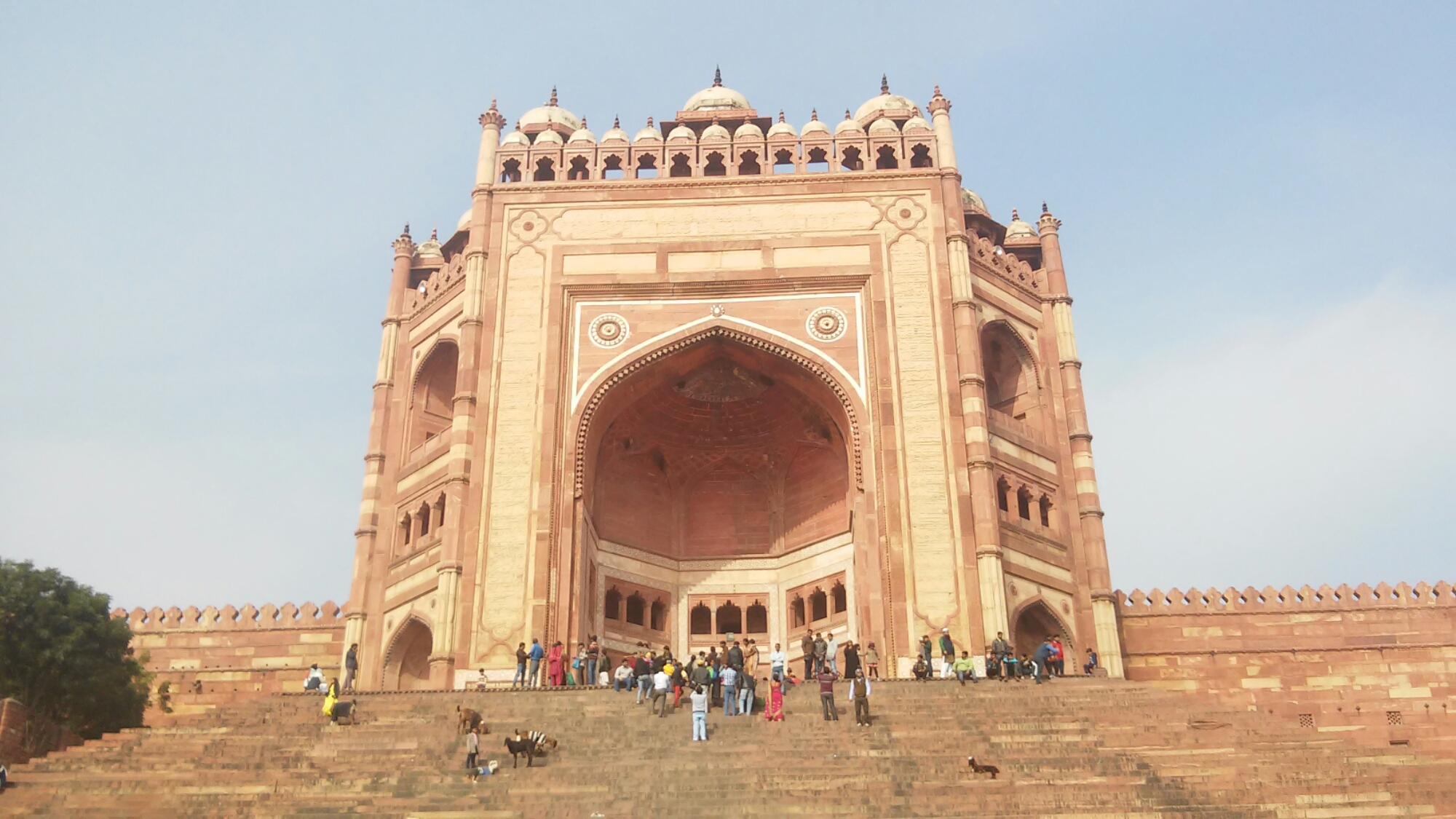 Nach Frühstück im Hotel nahm ich ein Tuktuk zum Busbahnhof und gelangte von dort nach einer Stunde Fahrt ins westliche gelegende Fatehpur Sikri. Der Ort hat eine kuriose Geschichte. Bis Mitte des sechzehnten Jahrhunderts war er nur ein unbedeutenders Dorf. Dann befand sich hier ein paar Jahrzehnte lang die Hauptstadt des riesigen Mogulenreiches, die europäische Besucher (eine Handvoll Jesuiten) mit London und Rom gleichsetzten. Die Einwohnerzahl erreichte angeblich eine Viertelmillion, für das sechzehnte Jahrhundert sehr viel. Nach dem Tod Akbars des Großen wurde Fatehpur Sikri aufgegeben und wurde binnen kurzer Zeit wieder zum unbedeutenden Dorf. Geblieben sind die Ruinen einer weitläufigen Palastanlage, die vielleicht schönste Moschee Indiens und der Titel „UNESCO Weltkulturerbe“.