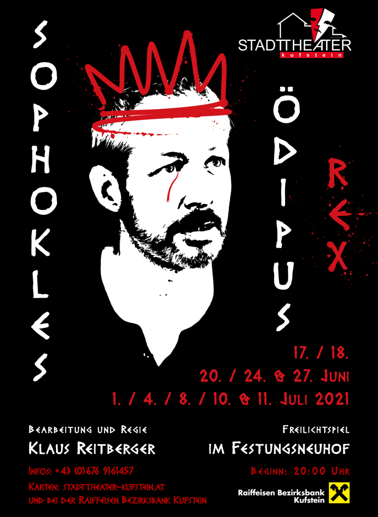 Eigentlich wäre ja die Wiederaufnahme des „Jedermann“ auf dem Programm gestanden. Doch zu groß wäre das Ensemble, zu eng und zu innig das Geschehen auf der Bühne. Des Weiteren würde das frühe, verpflichtende Ende der Aufführung um 22.00 Uhr sämtliche Lichteffekte zunichtemachen. Doch wenn A nicht geht, dann macht das Stadttheater Kufstein eben B. Freuen Sie sich also auf die ungeheuer spannende Geschichte des Königs Ödipus.