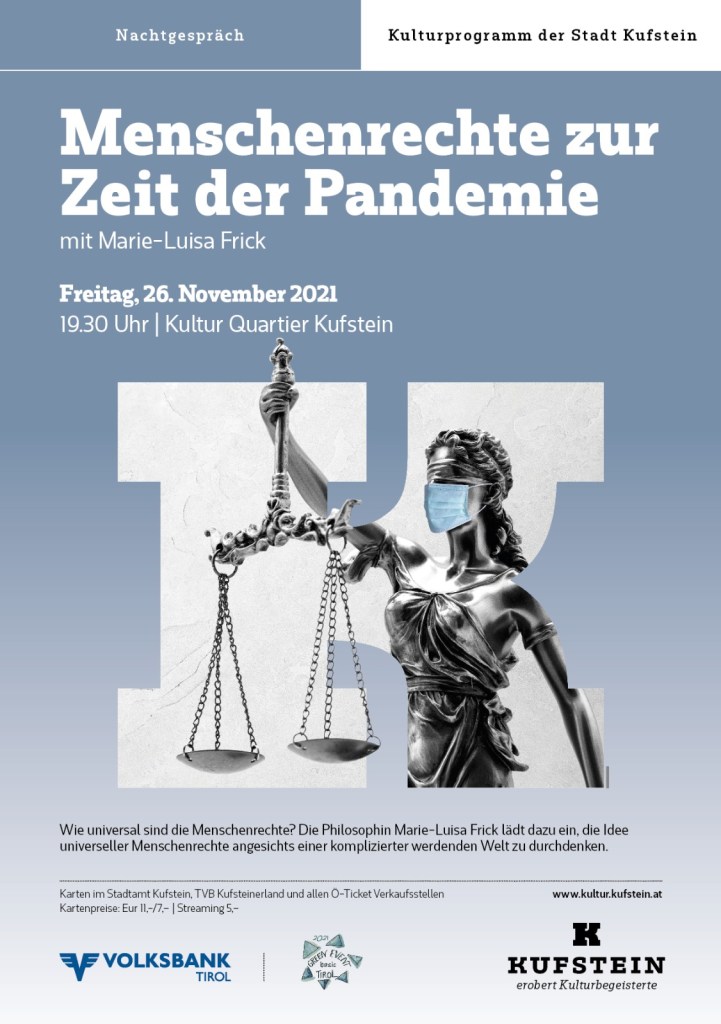 NICHT ABGESAGT, sondern per Online-Live-Stream durchgeführt wird auf jeden Fall das Kufsteiner Nachtgespräch nächsten Freitag. Die Thematik könnte kaum aktueller sein, vor allem jetzt, da eine Impfpflicht wieder im Raum steht: „Menschenrechte zur Zeit der Pandemie“ Klicken Sie sich rein und diskutieren Sie mit!Hier der Link zum Streaming-Ticket: https://www.oeticket.com/…/marie-luisa-frick-oeticket…/