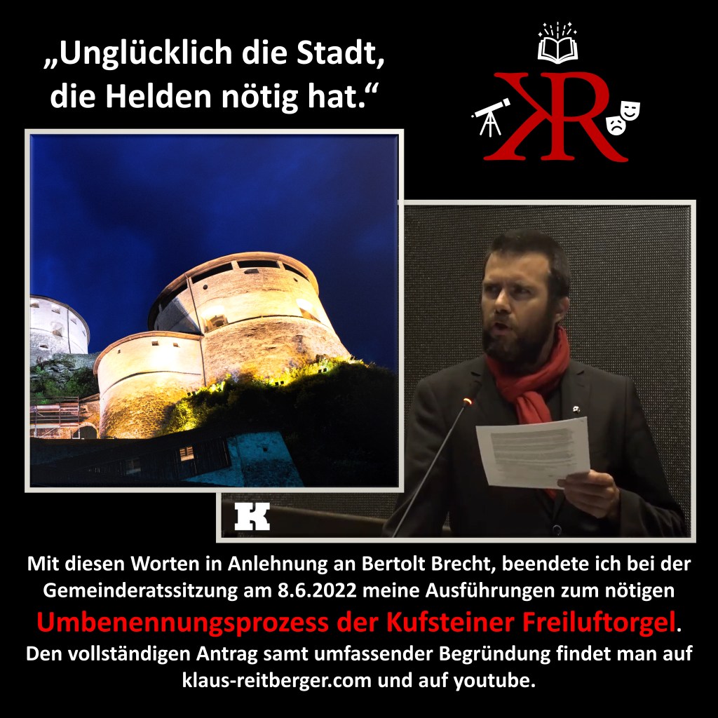 Kufsteins Leistungen in Sachen Vergangenheitsbewältigung sind in meinen Augen vorbildhaft. Mit der Publikationsreihe „Kufstein im 20. Jahrhundert“ sowie diversen Vorträgen von Seiten des Heimatvereins bzw. den wertvollen Arbeiten des Film- und Videoclubs wird und wurde hier viel geleistet. Umso frappierender ist der blinde Fleck, den die Kufsteiner Freiluftorgel in all dem einnimmt: