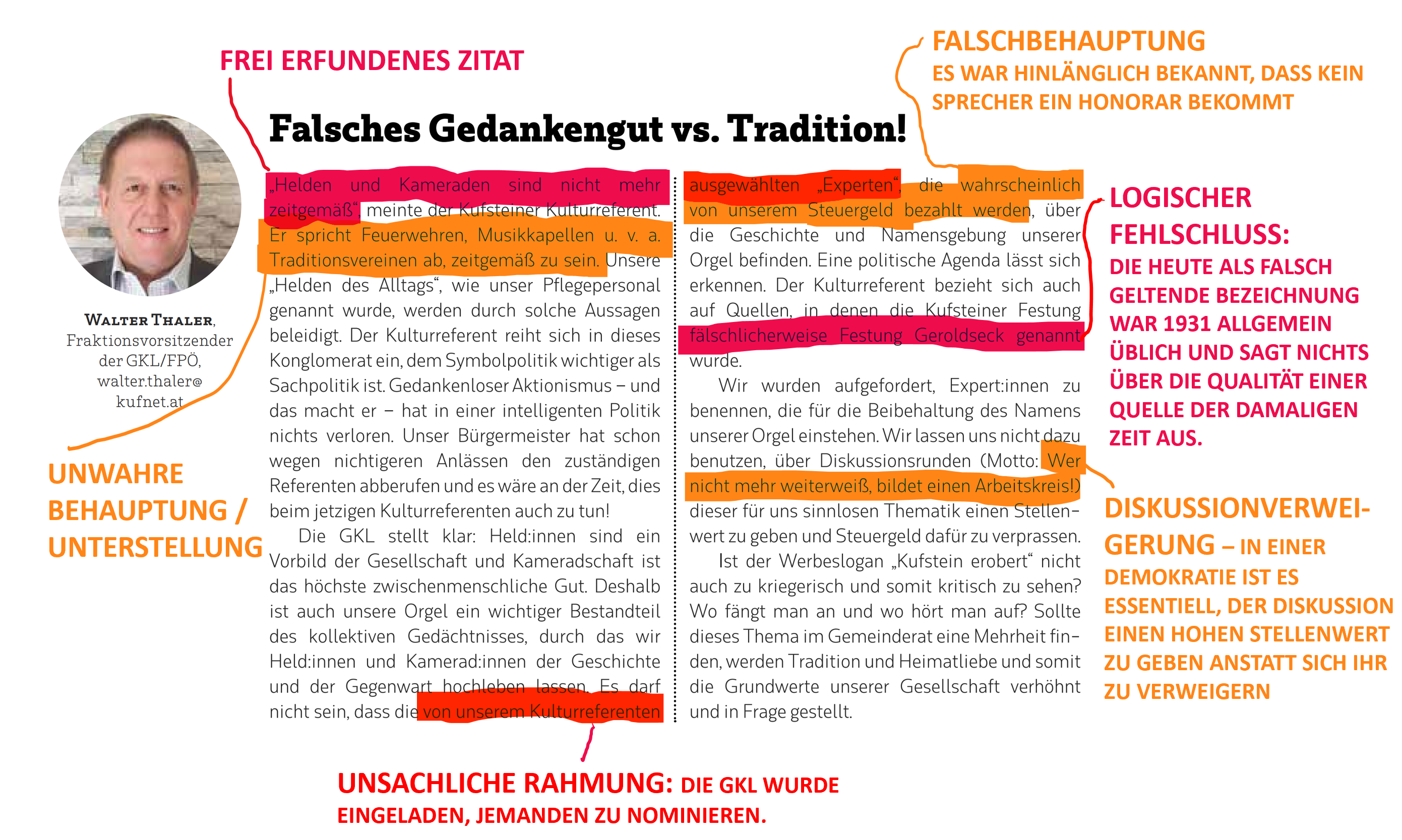 Im folgenden Beitrag möchte ich den Text des Kufsteiner Stadtrats Walter Thaler im Stadtmagazin vom Oktober 2022 analysieren, welcher ein hervorragendes und lehrreiches Beispiel gezielter Polemik auf kommunalpolitischer Ebene darstellt.